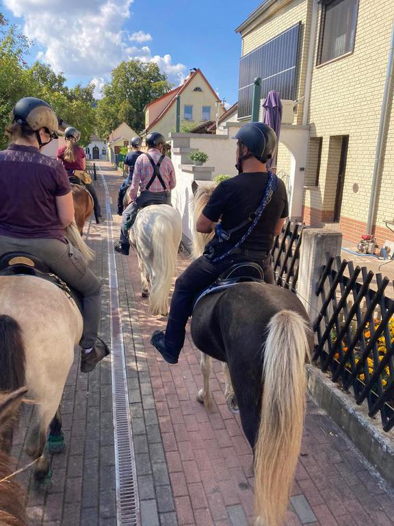 Am Freitag stand üblicherweise die Anreise zur Wolfsmühle in Rodishain auf dem Plan. In der Woche zuvor bauten Norbert und Lothar bereits die Paddocks für die Pferde auf. Den Platz dafür stellte die Wolfmühle bereit. 4 Anhänger mit 5 Pferden reisten an und eine Reiterin kam mit ihrem Pferd aus Nordhausen geritten. Am Freitag Nachmittag fand der Kennlernritt statt. Es ging über den Ritterberg nach Rottleberode und über die Felder am alten Stolberg zurück nach Stempeda und schließlich Rodishain. Nach einer erholsamen Nacht und einem herrlichen Frühstücksbuffet fand Samstag der große Wanderritt statt. Wir ritten durch den Wald nach Rottleberode und dort auf eine schöne Anhöhe mit einem Rastplatz. Dort wurde von Steffi und Swen ein herzhaftes Mittagsmahl zur Verfügung gestellt. Alle Reiter und Reiterinnen konnten sich ausreichend stärken und die Pferde konnten eine Pause genießen. Nach dem Mittag ging es durch Rottleberode und entlang dem alten Stolberg zurück nach Rodishain. Es waren insgesamt über 20 Kilometer. Die Pferde und Besitzer erfreuten sich an einem köstlichen Abendessen, danach gingen alle müde zu Bett. Sonntagmorgen ritten wir unsere Abschlussrunde entlang der Iberg Talsperre und über den alten Stolberg. Ein wunderbar, abwechslungsreiches Gelände, welches alle Islandpferde gut überwanden.
